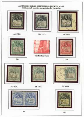 1924-33 display collection of R2/1 broken mast, used. ½d 1924, 1927 and 1932 printings; 1d 1924; 1½d (a little grubby); 2d 1924, 1927 and 1930 printings; 3d pair; 4d; 5d 1927 two examples, each with vignette colour affected, and 1930 printing, fine save for two blunt perfs at top left; 6d, postmark a little smudged; 8d, 1/- 2/- and 3/-. Very difficult to assemble. SG 10a-20a, £8725 (not counting the two 1927 5ds)