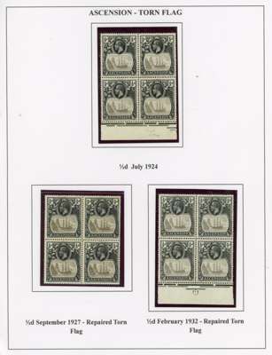 1924-33 mint collection of the R4/6 torn flag and repairs, presented on display pages. ½d three blocks, 1924 with the flaw, 1927 and 1932 showing the repair; 1d two singles, the 1932 grey-black and bright blue-green showing the repair; 1½d positional block unmounted, centred high to left; 2d in pair, and 1927 block and 1932 single (latter blunt corner) showing the repair; 3d and 4d in vertical positional pairs; 5d both printings showing the repair (both unmounted, 1930 with hints of foxing); 6d in pair; 8d in vertical positional pair; 1/- unmounted pair; 2/- and 3/- in vertical positional pairs. A splendid achievement. SG 10b-20b, £4585 for the variety stamps with no allowance for the repairs