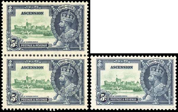 1935 Silver Jubilee 5d green and indigo vertical pair with Plate 2A R.10/6 kite and vertical log, mint, large part o.g. with the variety stamp unmounted; gum lightly toned. Also a mounted mint single with R.8/1 value tablet re-entry, hinge remainder at base. SG 33k, £400+