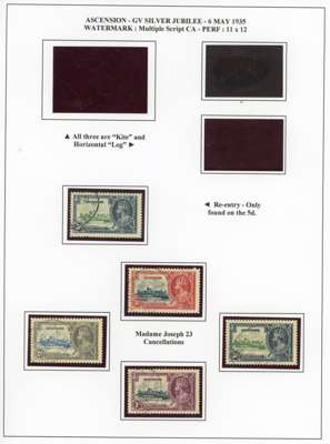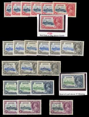 1935 Silver Jubilee collection including large part o.g. sets (2); used set with first day cancels; 1/- used block of four with oval registered cancels; used example of the 5d value tablet re-entry (as the listed variety on the Falklands 2½d), and a set with Madame Joseph Type 23 cancels. SG 31-4