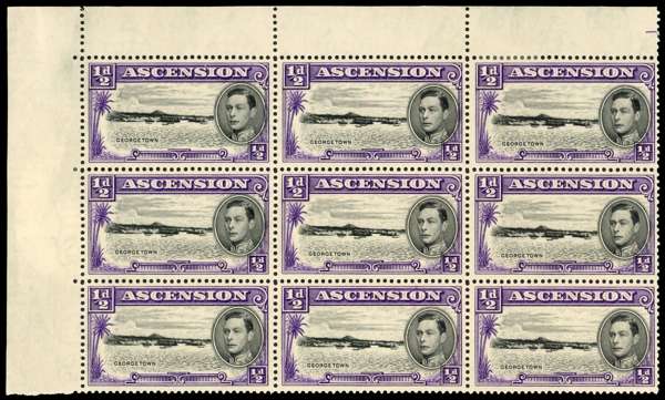 1938 ½d perf 13½ corner block of nine with R2/2 frame re-entry, without the R2/3 long ‘E’ flaw, unmounted o.g. Very scarce.