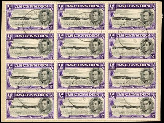 1938-53 ½d black and violet, perf 13½, used block of twelve, R1-4/1-3 without selvedge, used on piece with 10 JY 46 cds cancels. Shows R1/1 mark in sky, R2/2 strong re-entry to right frames and R4/2 line through left ‘2’, but no long ‘E’ on R2/3; a rare occurrence from the first sheets printed and the first time we can recall seeing a used multiple with definite evidence of its absence. SG 38.