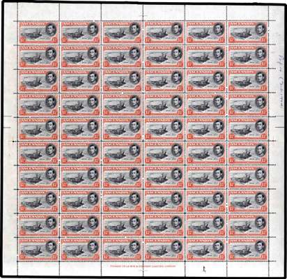 1949 1½d black and vermilion, perf 14. Complete sheet with R3/1 cut mast and railings, 5/1 davit flaw and 5/6 medallion re-entry, unmounted o.g. Central horizontal fold, inoffensive ink notation on right selvedge, otherwise fine. SG 40c, ca, cb, £1069
