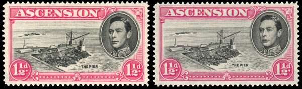 1938-53 1½d black and rose-carmine and black and carmine, perf 14, each with R.3/1 cut mast and railings variety, mint, large part o.g. SG 40db, eb, £600.