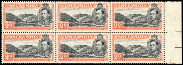 1938-53 2d black and red-orange, perf 13, right marginal positional block of six, with R.4/4 mountaineer flaw, mint, unmounted o.g. (hinged on the selvedge only). Fine. SG 41aa, £450+