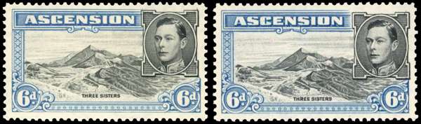 1938 6d perf 13½ large part o.g. with R5/4 ‘boulder’ flaw, and 1944 6d perf 13 unmounted o.g. with the same flaw. SG 43a, ba, £600