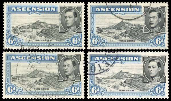 1938-53 6d black and blue group with 1938 perf 13½ and 1944 6d perf 13, each with R5/4 ‘boulder’ flaw, fine used. Also the same flaw on perf 13½ with Madame Joseph faked cancel #25, and perf 13 with part bogus GEORGETOWN cancel. SG 43a, ba, cat £480 for the genuine examples.