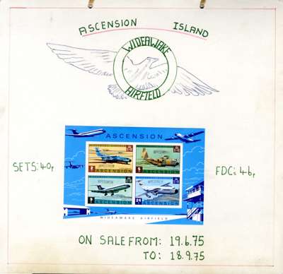 1975 Wideawake Airfield miniature sheet affixed to hand-decorated card (11½ x 11", each stamp handstamped SPECIMEN Type SH2. Original string (from hanging on the Post Office grille) included! SG MS191
