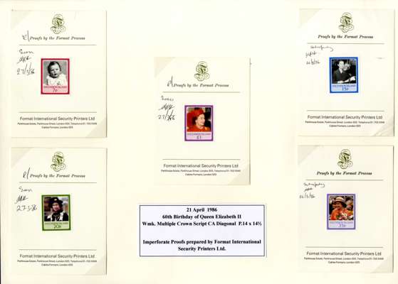1986 Queen's 60th Birthday set of five imperforate proofs, each on a separate Format card, signed off as ‘Seen’ or ‘Satisfactory’, initialled and dated 26 or 27/3/86. SG 397-401