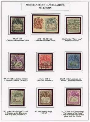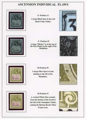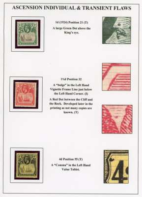 1924-33 group on display pages with transient and individual value flaws, as detailed in Stanton & Thorpe; 1d #21, 1½d #32, 4d #55, 5d #s 55 and 57, 3/- #12, and #35 used. All large flaws. Also two 5d Specimens from the 1927 and 1930 printings, the 1933 1d with repaired torn flag fine large part o.g., a page of cancels (including a 2/- with Ascension CDS, and part British Guiana arrival!); Ascension used in St Helena (5 including 2/-) and the much scarcer St Helena used in Ascension (½d, 1d x 2 and 6d pair), interesting lot