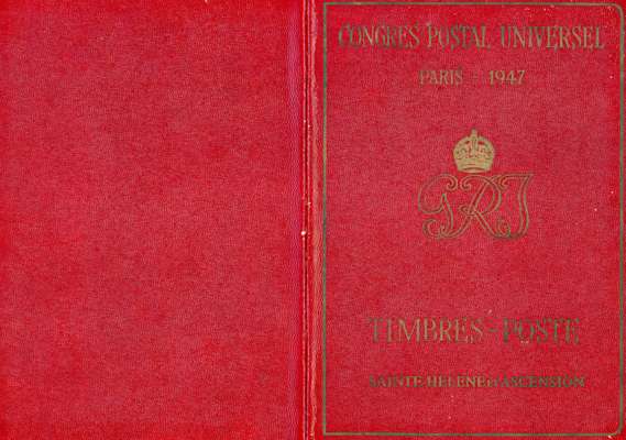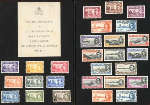 1947 maroon UPU Paris Congress presentation folder with Ascension and St Helena sets to 10/- as current at the time, plus Victory pairs, fine