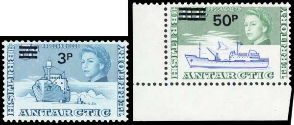 1971 decimal surcharges 3p on 3d and 50p on 10/-, each with inverted watermark, unmounted o.g. The 50p a lower left corner example. SG 29w, 37w, £270
