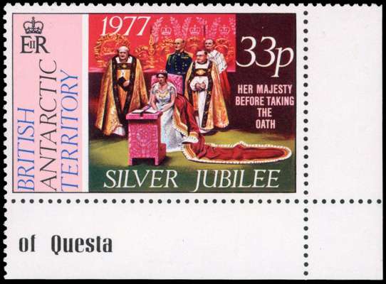 1977 Silver Jubilee 33p lower right corner example with part imprint, watermark Crown to right of CA, unmounted o.g. SG 85w, £240