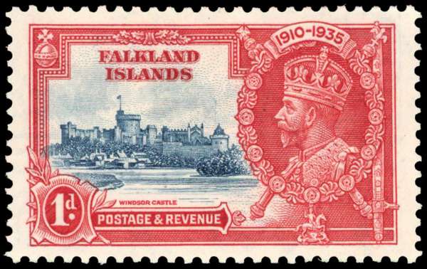 1935 Silver Jubilee 1d with Plate ‘5’ R7/1 flagstaff on right turret, part o.g with heavy hinge remainder. SG 139d, £450