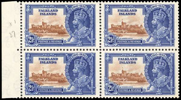 1935 Silver Jubilee marginal block of four with Plate ‘5’ R7/1 flagstaff on right turret, large part o.g. SG 140d, £500