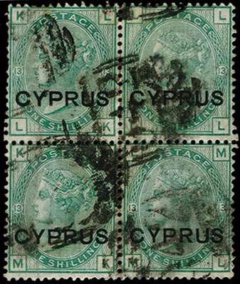 1880 (1 Apr) 1s green, plate 13, block of 4 lettered 'LK/ML', used with '942' numerals of Larnaca, leaving clear profile on 'MK'. Some imperfections (left pair with creasing and other tiny blemishes) but a scarce and impressive multiple. Only 2880 issued. (cat £1900+)
