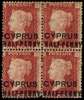 1881 (Feb) 'HALF-PENNY' on 1d red, type 3 (18mm) surcharge, plate 201, block of 4 lettered 'FC/GD', large part o.g. with fine colour. Slight separation at foot, with some gum creasing and trivial blemishes, but a very scarce block.