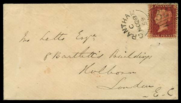 1857 1d Rose red Pl.36. Very fine used example lettered GL, neatly tied to an uncreased envelope by a Grantham "321" type VIII sideways duplex for NO.28.1859. Addressed to London with a receiving cds on reverse for the following day. A lovely example of this scarce sideways duplex. Spec. C10(5).