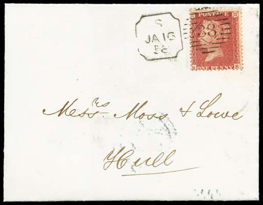 1858 1d Rose red Pl.34. Very fine unfolded wrapper sent from London to Hull bearing a 1d rose-red Pl.34 neatly tied by a crisp code "S" London City "38" late fee duplex for DE.6.1858. Backstamped by a red London arrival cds for the following day.