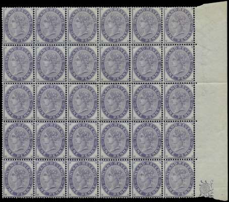 POSTAL FISCAL: 1867-81 white to bluish paper, 1d. purple (Die 2), right marginal block of thirty (6 x 5) showing part marginal illustration, slight separation between rows two and three, a few minor bends not detracting from superb fresh colour. Fine unmounted mint. (30). SG F20, £1,000+