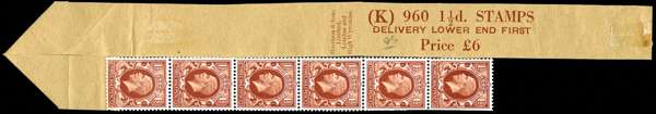 1935 1½d Red-brown. Very fine brown on brown coil leader (Code K) for lower end delivery with six stamps attached. Scarce.