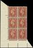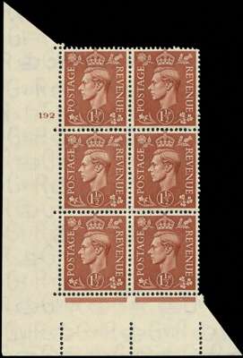 1942 1½d pale red-brown lower l/h corner marginal plate '192' no dot block of 6 (2 x 3) showing R19/1 'Retouched forehead'...