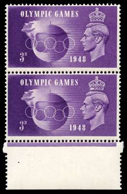 1948 3d Olympic games. Very fine unmounted o.g. bottom marginal vertical pair showing variety "Hooked 3" (Cyl.1 no dot, R19/2) and "Crown flaw" (Cyl.1 no dot R20/2). Spec. QCom15c & QCom15a.