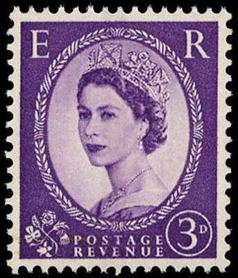 3d deep violet, (SG 575var/Spec ST7(4)c) 2mm blue phosphor centre band, printed under the ink, perforated on gummed Crowns...