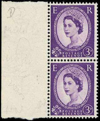 3d Deep violet, perforated left-hand marginal vertical pair on gummed Crowns watermarked (upright) paper, with a 2mm blue...