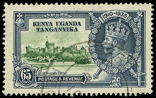 1935 Silver Jubilee 65 cents green and indigo with 'diagonal line by turret' variety (Pl. 2A R10/1-2), lightly used example with 'Dar-Es-Salaam' cds. SG 126f