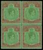 1942 10s, perf 14½ line, ordinary paper, yellow green and carmine on green, u/r corner block of 4, no selvedge, showing position #12 damaged leaves and mashed jewels (SG 119b), usual brownish gum and slight foxing on reverse, fresh appearance, u/m, cat £2,200