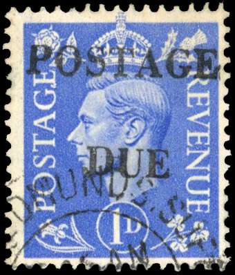 1951 1d Light ultramarine - Bury St Edmunds Postage Due (SG504var). Very fine used Bury St Edmunds, provisionally overprinted ‘POSTAGE/ DUE’ to alleviate a shortage of postage due stamps on the morning of the 7th June 1951. Cancelled by a Bury St Edmunds datestamp. Very rare, only a few used examples are believed to exist. SG504var.