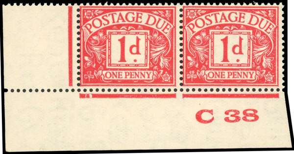 1938 1d Carmine Postage Due (SG D28wi). Very fine unmounted o.g. bottom left hand corner marginal ‘C38’ control pair with watermark sideways-inverted. Superb positional piece of this difficult watermark variety. SG D28wi.