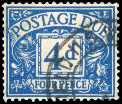 1951 4d Blue Postage Due (SG D38wi). Very fine used example cancelled by a part cds cancellation. Scarce so fine. SGD38wi. Cat £1,000.