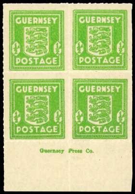 1941 Guernsey ½d Emerald mint imprint block, printed on the gummed side