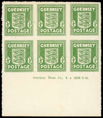 1943 ½d Olive-green, Guernsey ‘Arms’ issue. Very fine unmounted o.g. imprint block of six from the 8th printing showing sheet imprint at foot "Guernsey Press Co., 8 x 120M/2/43". Scarce shade/printing. Cat £280 as singles alone. SG1e, Spec. GW12e.