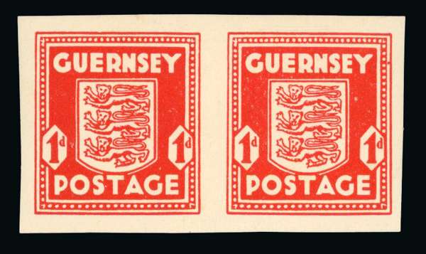 1941 1d Scarlet, Guernsey ‘Arms’ issue. Unused o.g. imperforate horizontal pair.