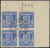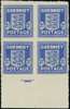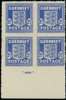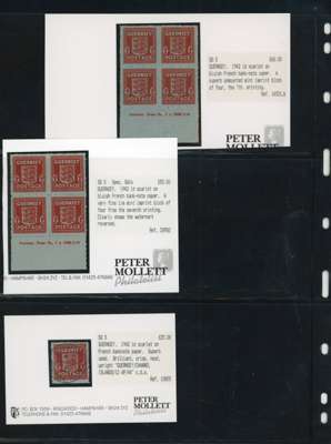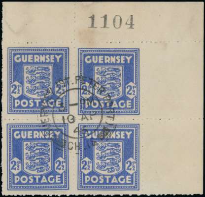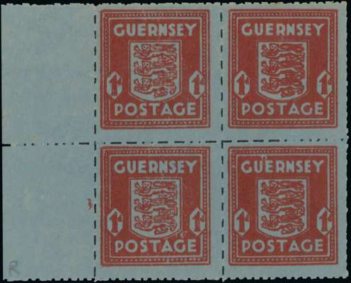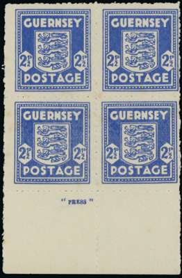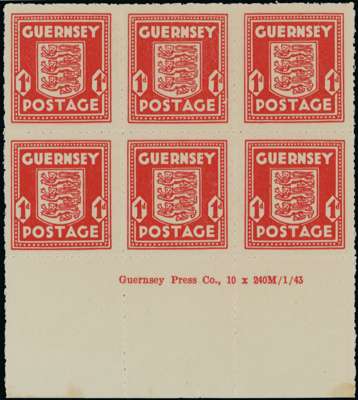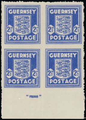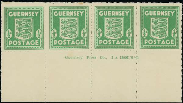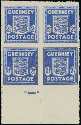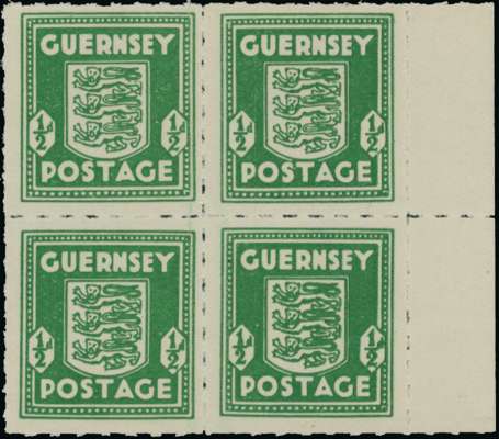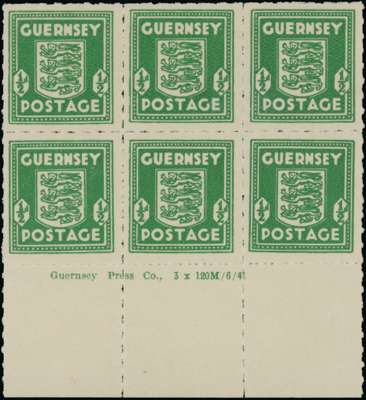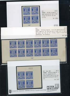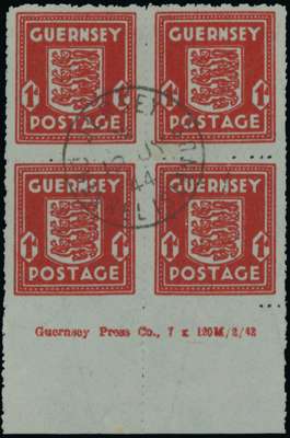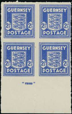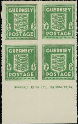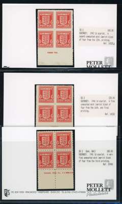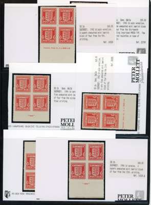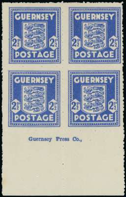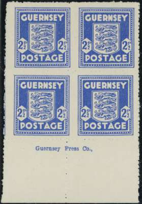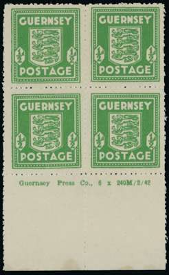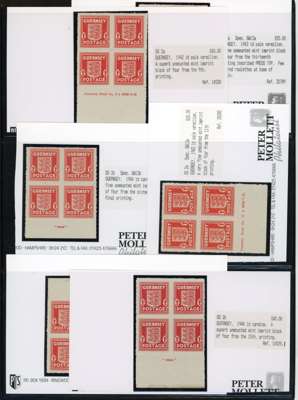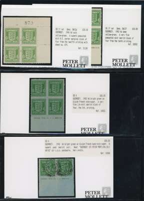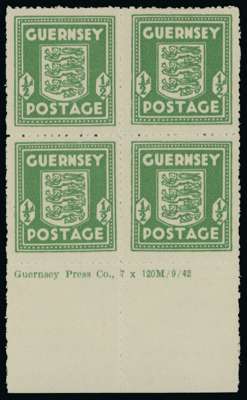 1941-44 Arms of Guernsey occupation issues (SG1-5). Spectacular group of mainly unmounted o.g. imprint blocks of four additionally offered with several sheet number blocks and some used blocks and a pair. Including several examples of the more difficult shades for the ½d issue, imprint blocks from the bluish French bank note paper issues, watermark varieties etc. A spectacular group (47).