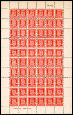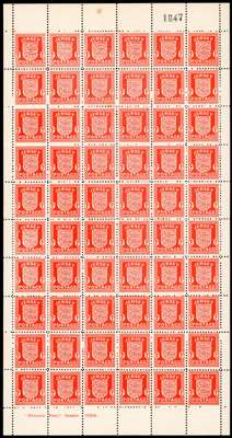 1941 Jersey Arms 1d Scarlet War Occupation issue. Two unmounted o.g. complete sheets of sixty.