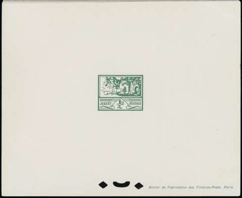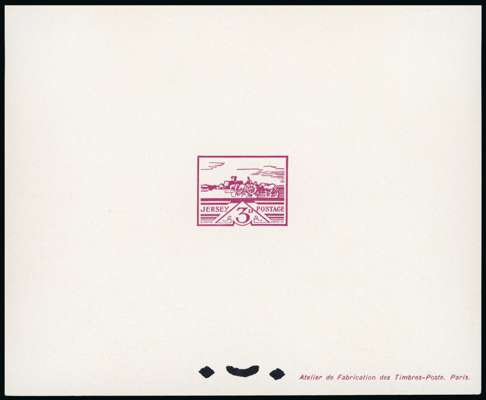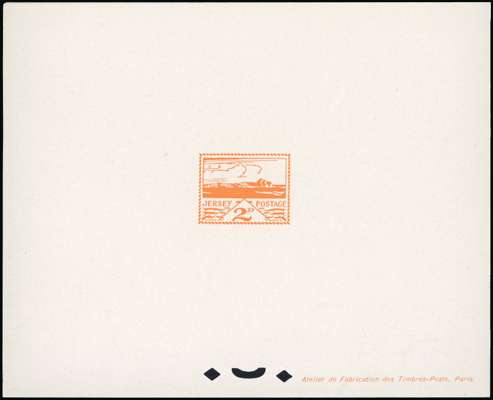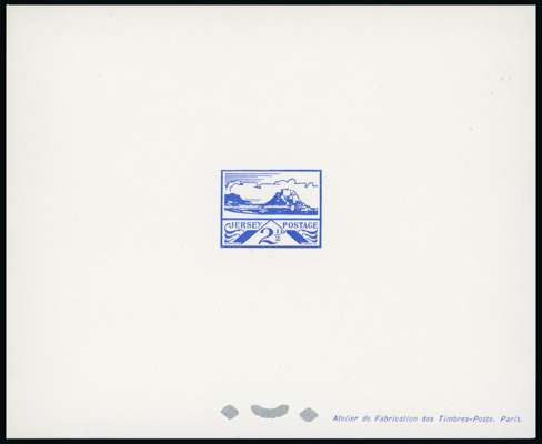 1943 ½d to 3d Jersey ‘Views’ Occupation Issue. Set of six imperforate “Epreuves-de-luxe” presentation proofs in issued colours with imprint ‘Atelier de Fabrication de Timbres-Poste, PARIS’ at foot with tissue paper attached. SG3-8. Cat. £1,050.