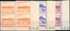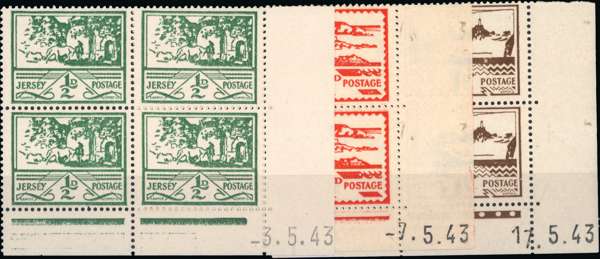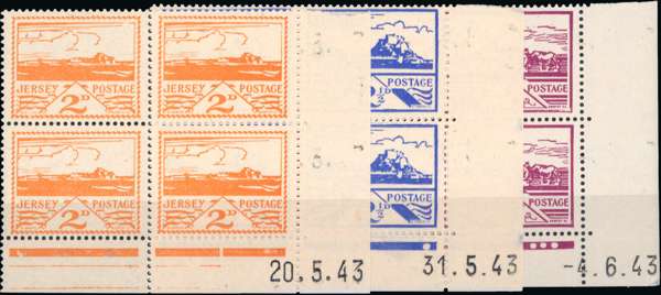 1943-44 ½d-3d Jersey Views War Occupation Issue. Very fine unmounted o.g. set of six in corner marginal blocks of four each dated at bottom right, offered with a set of nine singles including grey/newsprint paper varieties. Cat £150+