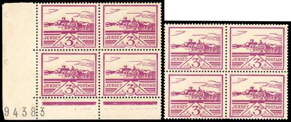 1943 3d ‘Gathering Vraic’ War Occupation Issue. Very fine unmounted o.g. bottom left hand corner marginal block of four, printed on the gummed side with sheet number ‘94383’. Offered with a normal block for comparison. SG 8var.
