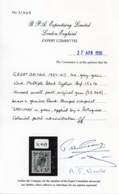 1938 4d Grey-green (SG468var). Unused small part o.g. example overprinted ‘SPECIMEN’ in green, applied by the Portuguese Colonial Postal Administration. Very scarce. 1990 BPA Cert.
