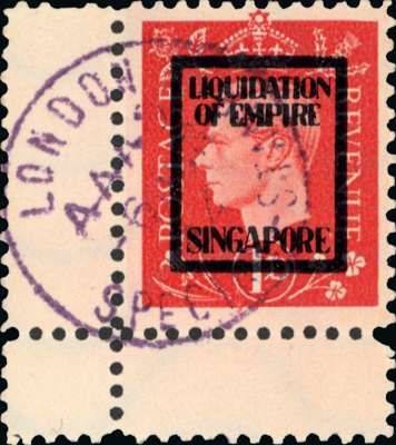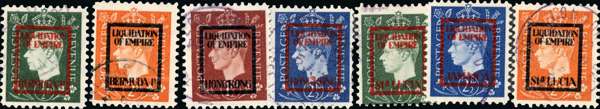 German Propaganda Forgeries. Bermuda ½d and 2d, Hong Kong 1½d and 2½d, St Lucia ½d (short perf), 2d and 2½d and Singapore 1d, all ‘used’