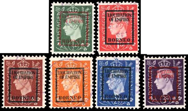 German Propaganda Forgeries. ½d - 3d set overprinted boxed LIQUIDATION OF EMPIRE BORNEO, fine ‘used’