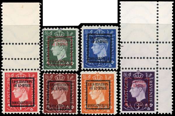German Propaganda Forgeries. ½d - 3d set overprinted boxed LIQUIDATION OF EMPIRE BOUGAINVILLE, fine, the ½d and 2½d ‘used’, the others unused