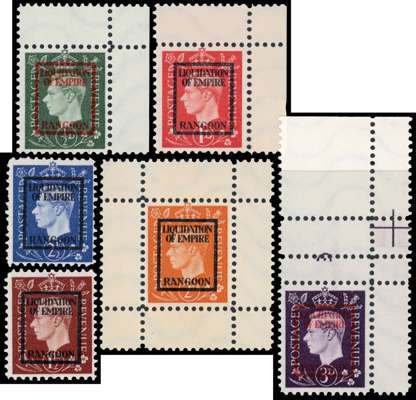 German Propaganda Forgeries. ½d - 3d set overprinted boxed LIQUIDATION OF EMPIRE RANGOON unused, fine save 2½d with some shorter perfs