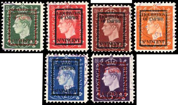 German Propaganda Forgeries. ½d - 3d set overprinted boxed LIQUIDATION OF EMPIRE St VINCENT ‘used’, fine save 3d with perfs slightly uneven
