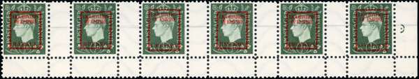 German Propaganda Forgeries. LIQUIDATION OF EMPIRE overprints ½d horizontal marginal se-tenant strip of six unused, RABAUL, BORNEO, GRENADA, RANGOON, BOUGAINVILLE and St VINCENT. Rare
