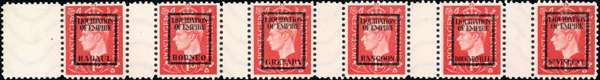 German Propaganda Forgeries. LIQUIDATION OF EMPIRE overprints 1d horizontal se-tenant strip of six unused, RABAUL, BORNEO, GRENADA, RANGOON, BOUGAINVILLE and St VINCENT. Rare